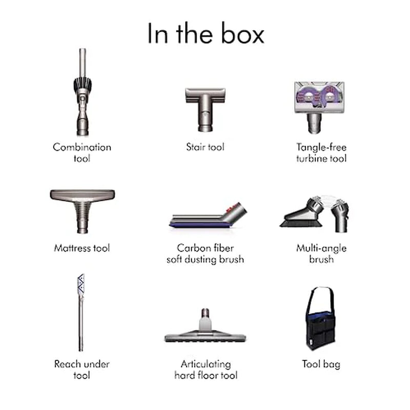 9 Dyson-engineered accessories include the tangle free turbine tool, combination tool, multi-angle brush, articulating hard floor tool, stair tool, reach under tool, carbon fiber soft dusting brush, mattress tool and tool bag.